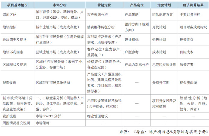 在项目投资决策环节,项目总除了要关注投资决策指标和经济测算逻辑,还要关注在该环节可能用到的可研报告模板,通常包括项目基本情况、市场分析、营销定位、产品定位、运营计划、经济测算结果六个方面的内容。如表1示例。