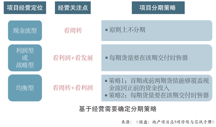 项目总要基于经营需要来确定分期策略和首开楼栋。以项目分期为例,不同经营定位的项目因经营关注点的差异,项目分期策略有所不同。如图2、表3。