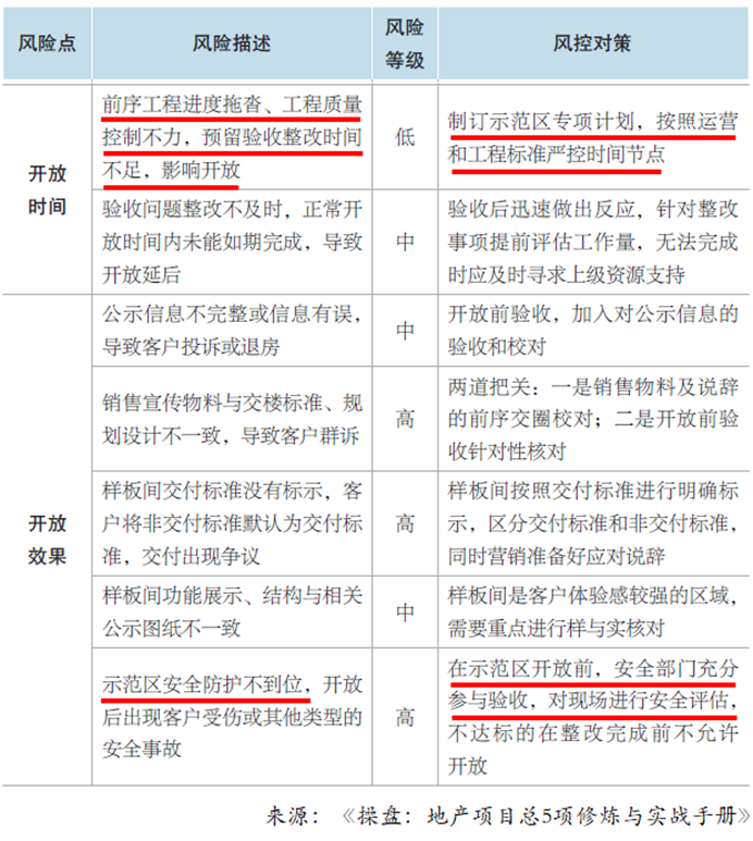 通常建议示范区开放前两周以上开展首轮验收,明确每一轮的部门和人员安排,如有总部验收要求需提前与总部相关条线联系;项目总要依据验收职责,提前通知相关部门,建议验收的专业组成包括工程、设计、营销、运营、客户关系;项目总应以示范区开放节点倒排各项计划,包括各轮验收、整改等,把控展示效果与节点进度的平衡。