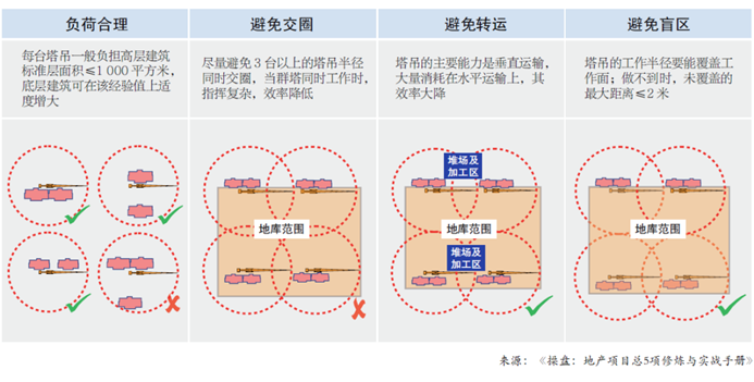 主体进度要靠塔吊来保障。一方面,从安装位置来看,塔吊一旦安装,在整个工期内无法调整位置,主体工程需要的最大垂直运力也就固定下来;另一方面,从数量来看,如果塔吊数量不够,会严重影响进度,延误工期对项目经营的影响会大于塔吊的支出。如图6。