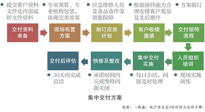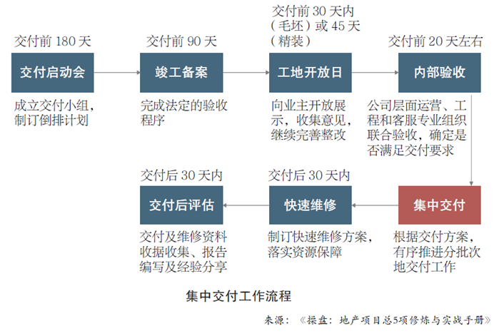 项目总在项目集中交付环节的关键管控要点,主要在于梳理集中交付期流程、参与策划交付计划、落实工地开放活动、细化集中交付方案以及快速维修。梳理集中交付期流程,包括相应的时间安排和流程各环节的具体责任单位、要求和工作事项。如图11。