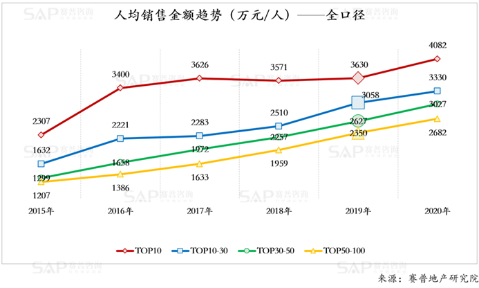 单就2020年来看,TOP10人均销售金额相较下一个规模梯队而言,级差显著加大,侧面反映出人均销售金额的规模效应,随着头部企业的集中化趋势,显现出更高的增长速率。如表1。