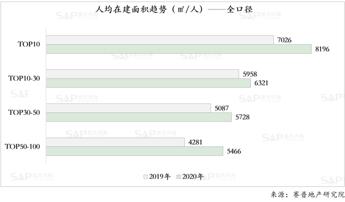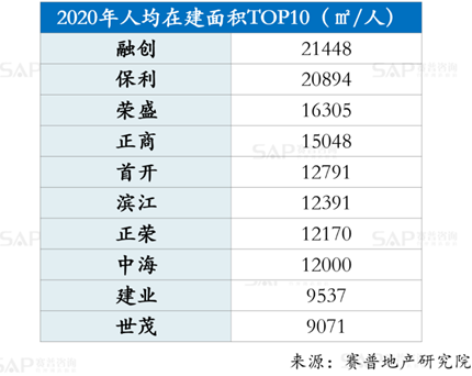 从数据可以看到,不同于2019年各梯队间人均在建面积级差的均等化(梯队间相差17%-19%),2020年房企人均在建面积的TOP10梯队优势明显增强,人均在建面积达8196㎡/人,高出TOP10-30梯队30%以上,呈现出明显的头部规模优势。