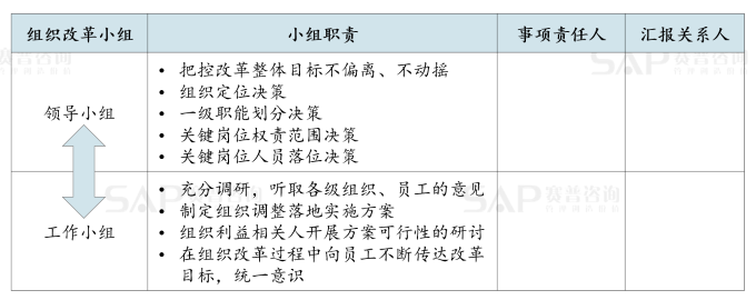 其次,内部可设立组织改革小组,组长同为领导小组成员兼任工作小组组长,小组负责组织推动目标执行,在过程中及时回顾目标,落实事项责任人,由事项责任人负责联动其汇报关系人,切小单元,快速决策,统筹推进改革工作。如表1