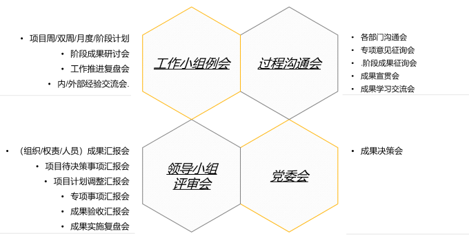 需要强调的是,并不是所有会议都采用“自下而上”推进工作,有的企业也会采用“自上而下”推行,由领导小组直接决策,之后过程沟通会仅是信息告知,统一执行节奏,有时则是对滞后事项的有效干预,以保证目标的高效达成。