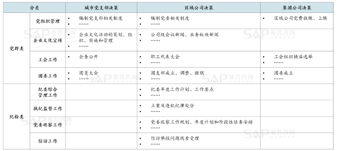 第二,对党群部门的工作事项也需要梳理出明确的权责界面。国企的党群、纪检等职能相对独立,原则上沿用原有职能,在职能划分和权责上主要是厘清界面,便于内部业务体系的理解和协同。如表2示例。