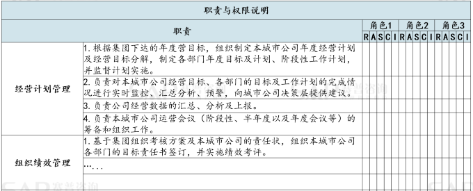 明确组织调整后的岗位设置、岗位职能/部门角色定位、事项分工、职能事项的分解执行,将岗位编制标准与企业应用实际进行深度结合,便于掌握基本的工作界面划分。如项目总、城市总、分管领导等具体事项明确角色分工,促进组织单元事项闭合自驱运行,类同于“管头管尾,而非从头管到尾”,保持各级组织单元/岗位活力。