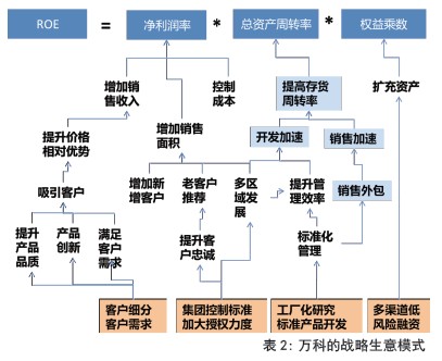 万科自战略变革以来,确立“以住宅地产开发与管理”为主的主营业务板块,目前已然成为中国房地行业住宅地产的绝对老大。万科所采用的战略便是通过客户细分、提升相对价格优势来提高销售收入,通过工厂化生产和住宅产品标准化来降低开发成本,通过标准化项目加快开发速度。同时,在面临行业调控时不惜率先降价以促进销售,加速回款。(如表1)