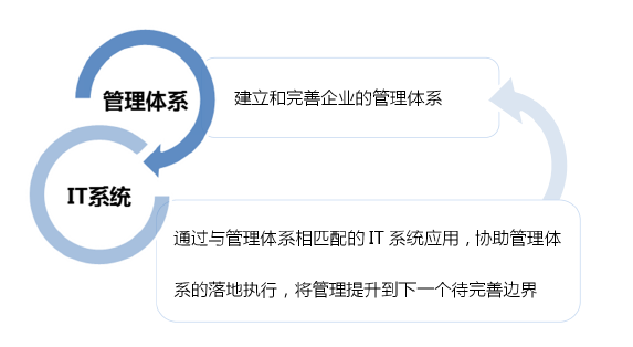 企业的IT规划需要站在行业的管理经验和IT经验基础上进行规划,它需要与企业的发展战略和发展能力相匹配,对于企业来说管理的提升都需围绕着管理体系和IT系统这两个要点,循环前行: