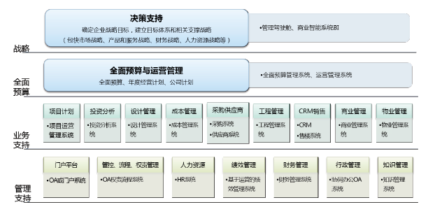 人力支持(人力资源系统): 在人员较多的情况下,需引入人力资源管理系统协助人事部门的管理工作。其中,基础人力资源管理主要负责对企业的招聘管理、入职离职管理、人事资料管理、培训记录、请假出差管理等;高级人力资源管理主要进行绩效管理和薪酬管理,目前由于地产行业的特殊性,通用绩效管理系统无法很好的支持行业的绩效管理应用,所以在人力资源系统建设方面,建议先进行基础人力资源管理。