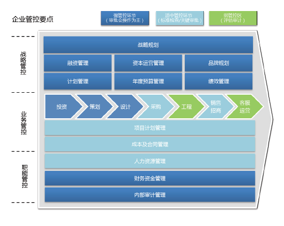 上图可看出,该企业在战略管理期间对于强管控的环节在于:全面的战略管控,业务管控包含了投资、策划和设计这三项前期重点环节,职能管控中强调财务资金管理、内部审计管理;对于适中管控环节在于业务管控中的计划、采购、销售、招商和人力资源管理;对于弱管控的环节在于工程和客服、运营。