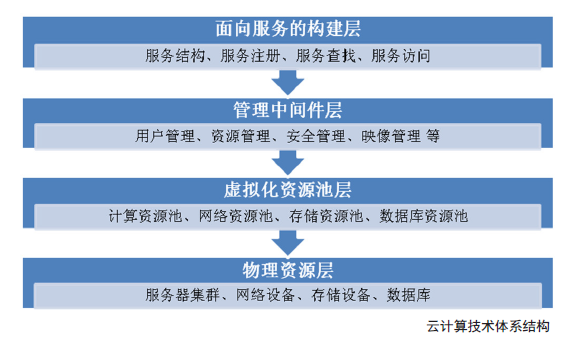 云计算技术体系结构分为4层:物理资源层、资源池层、管理中间件层和面向服务的体系结构(SOA)构建层。