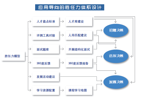 调查显示,已建设胜任力模型的企业中,一半以上束之高阁,三成左右临考核时拿出来过过场,只有不到两成的企业能够在人才发展过程中有所应用。究其原因,企业的说法几乎都是:看着挺好,不知道怎么用。可见,缺乏系统的落地手段承接,是胜任力模型应用的短板。我们在辅导客户时,主张采取“应用导向的胜任力体系设计”。也就是说,本着“以用致学”的思想,根据企业胜任力模型关键应用需求, 设计模型本身以及应用工具。