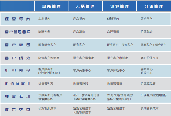 对客户的了解,包括共性和个性的了解,共性为,个性为,客户细分则是对客户类别的 定位。如果说差异化是一种竞争战略,那么差异化竞争的基础则来源于客户细分,广泛的外部客户细分带来市场的细分,决定红海还是蓝海;特定外部客户的细分带来产品的细分,产品线的规划与分类 ;内部客户的细分带来专业的细分,七对眼睛或是八对眼睛。企业理应重视客户,但在不同阶段,对客户的管理能力要求也有所不同,我们根据经营导向、客户管理目标等大致将房地产企业的客户管理划分为四个阶段——服务管理、关系管理、体验管理及价值管理。