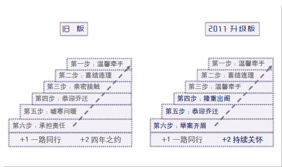 持续的创新需要持续的学习能力、吸收能力和转化能力,但前提还是要学习。1996年华润创业收购万科旗下饮料厂怡宝蒸馏水后,负责收购事宜的执行董事黄铁鹰在被问及对万科的感受时说,这是一个可怕的公司,因为他们不拒绝学习。万科在成长的路途中,持续地寻找标杆、学习标杆。2003年开始学习帕尔迪,学它的专注和运转周期,学它的客户管理,甚至学它的过冬之法,同时,也学习了它的学习能力。 2004年万科将客户服务部更名为客户关系中心 ;2005年客户关系部门全面介入项目发展过程,开发实施了国内第一个完全基于地产业务的客户信息管理系统;2011年,万科 启动千亿计划,均源自不断的学习。2011年,我们看到了万科“6+2”步法的升级版,我们能够从管理的角度看到关怀程序的进一步合理化 (将交付与搬迁分为两步);从客户的角度看到更贴近彼此关系的温情暖语(将承担责任改为举案齐眉);从责任的角度看到更为持续性的甚至终生制的呵护(将四年之约改为持续关怀)。
