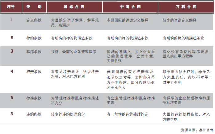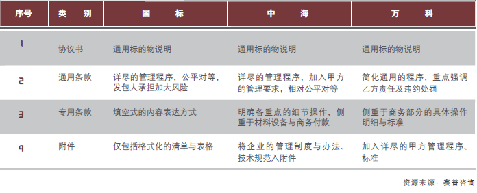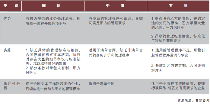 选取国内市场应用广泛的国标合同及两个标杆企业中海、万科的工程合同进行对比分析: