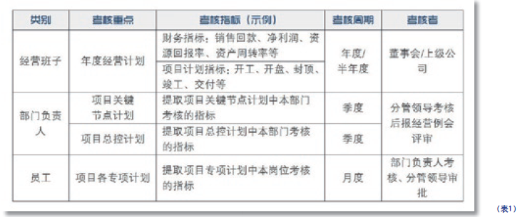D 公司在总结以往开发项目和借鉴标杆企业经验的基础上,建立了项目开发三级计划架构,即项目关键节点计划、总体控制计划和各专项工作计划,形成以典型项目为代表的项目关键节点计划模板、项目总体控制计划模板、项目各专项工作计划模板,通过充分讨论沟通确定了每项计划完成的标准要求。有了这些模板的支持,D公司对目前开发项目的各级计划进行梳理和完善,为计划考核打下了基础。表1是D公司各级人员计划考核示例: