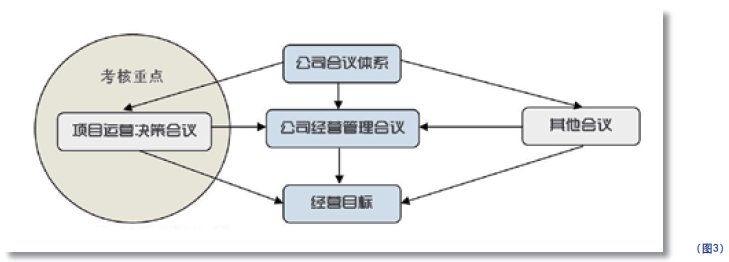 该公司会议分为三大类 :一类是公司经营管理会议;第二类是项目运营决策会议,关注项目开发过程中关键事项的讨论、评审和决策; 第三类是非公司层面的其他会议, 关注部门与部门之间工作的沟通、协调等。其中,各类项目运营决策会议是否有效召开直接影响项目进度和质量,故重点考核项目运营决策会议。D公司的会议管理体系见图 3: