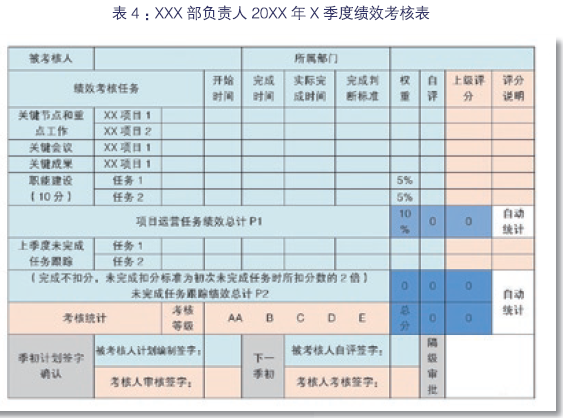 D 公司的绩效考核与计划运营管理紧密绑定和联动,同时对上一考核周期未完成任务进行跟踪考核, 加大了未完成任务的考核力度,通过绩效考核有效监测项目开发情况,并为持续改进提供了依据。D公司绩效考核表示例(表 4):