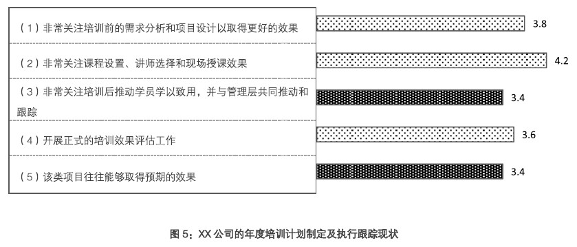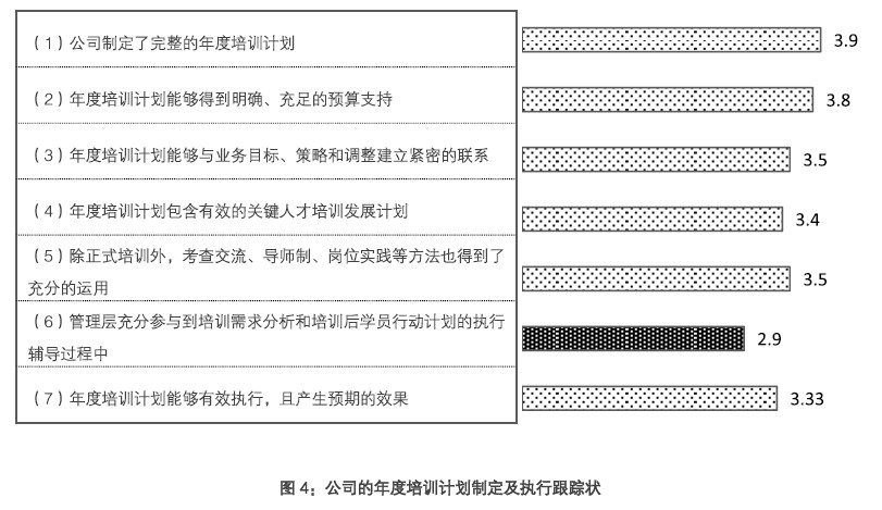 调研结果显示(满分为5分),在大部分企业当中,培训仍然被认为是“人力资源部那些家伙的事”,直线经理并没有充分参与到培训前后的需求分析和跟进辅导当中。培训与业务目标的联系需要进一步加强、增加聚焦关键人才的培训计划、丰富培训与发展手段,是企业在制定年度培训计划中需要着重加强的环节。