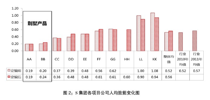 配置模型输出结果在具体岗位上明确了配置标准,对各项目公司的整体人均效能的横向比较和分析,也是人力配置的重要依据: