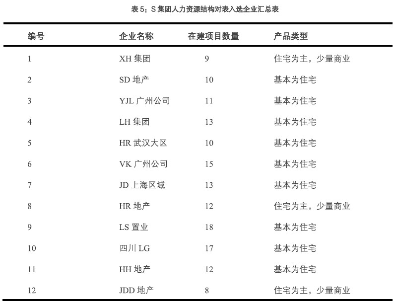 由于第二步中筛选所得样本企业处于不同的发展阶段,他们的管理精细化程度、人员成熟度以及资源整合程度与S集团差异较大,这决定了其管理现状不足以作为当前S集团总部人力配置参照。因而,项目组进一步从赛普房地产企业数据库中,筛选出业务规模、产品构成上与S集团相似程度更高的十二家地产开发企业,作为人力资源结构对标样本: