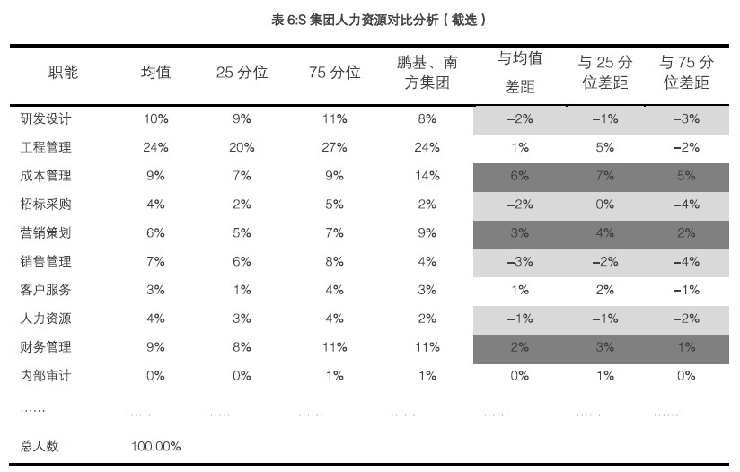 上述标红色和绿色的数据,分别代表着S集团该职能较样本对标企业整体偏低和偏高。这可以作为职能人员数量调整的参照依据之一。