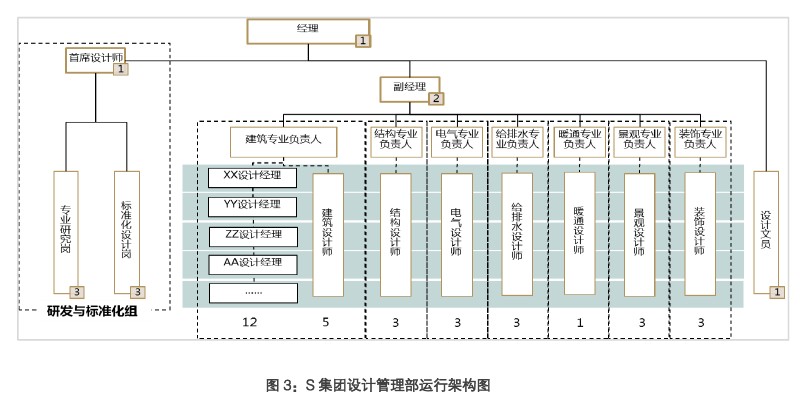 S集团采取的是设计集中管理的模式:总部从概念设计一直做到到施工图阶段,施工阶段派驻项目设计经理至项目公司,对接现场设计问题。因而,设计管理部的总人数就是公司所需设计人员总数。设计管理部内部职能分为研发与标准化和项目设计管理两个模块。其运作模式分别如下: