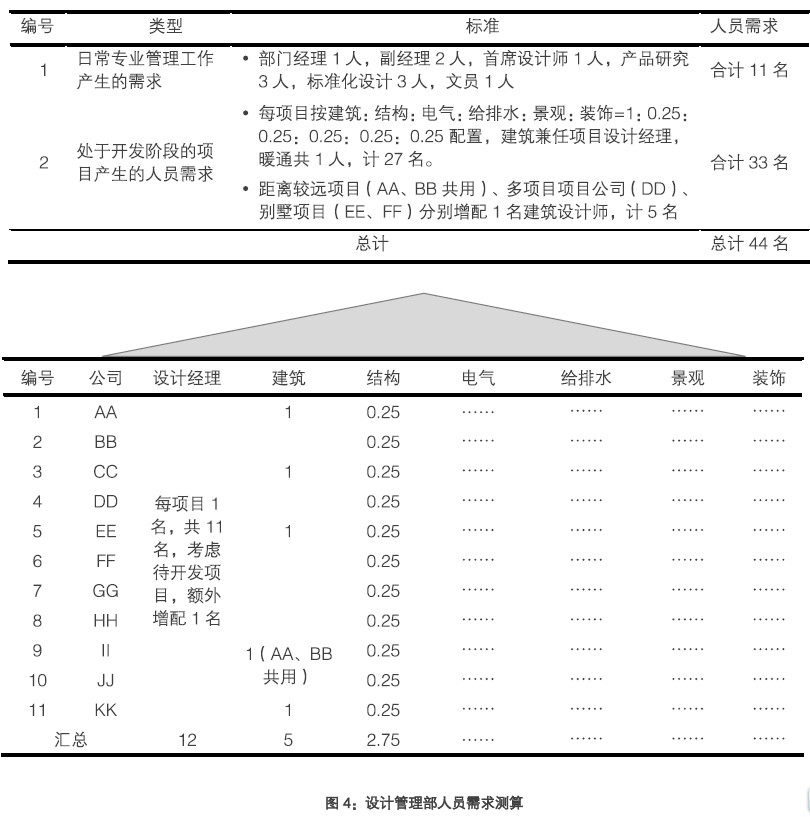 研发与标准化模块由建筑设计专业牵头,其他专业配合。考虑到目前该模块工作处于起步阶段,并且未来对于项目设计管理模块处于专业指导地位,该模块人力配置要求少而精。