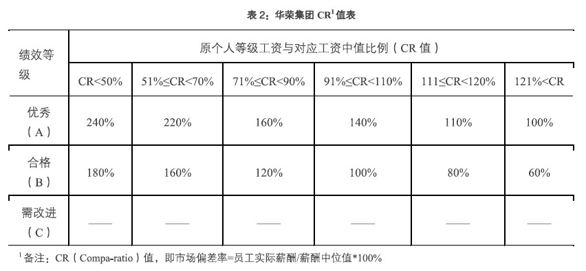 确定薪酬标准后,如何对关键岗位员工的薪酬进行调整,同时又能得到其它岗位员工的认同是一个难点,同时也是一个重点。经过研讨,华荣集团决定采纳我们的建议,引入CR值,在薪酬调整中“小步快跑”,结合绩效考核,以半年度为周期对薪酬进行调整。