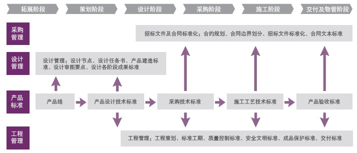 第一个一体化指设计、采购、工程专业技术和管理的一体化,最终形成了各专业模块的工作标准。设计标准纳入到设计管理的各类管理输出成果中,或者成为设计管理的工具,如设计任务书、设计审图要点等;采购技术标准纳入到采购招投标和合同文件中,同时明确采购验收标准,成为输出给材料设备供应商的技术要求和工程施工阶段材料设备的验收标准要求;施工工艺标准也将纳入招标文件及合同中,成为工程营造过程中对施工单位的营造要求,对监理单位和甲方监控的要求;这样有效的形成了产品技术标准和管理活动的融合,有效的提升了专业人员的管理水平和管理的精细度。