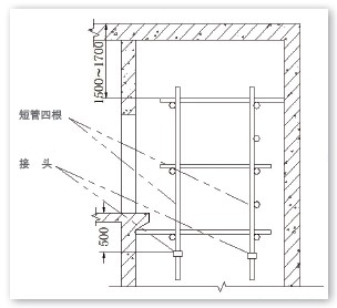 施工顺序:脚手架搭设→样板架制作安装→测量井道,确定标准线→样板就位,挂基准线。脚手架平台最高点位于井道顶板下1.5 ~ 1.7m 处为宜,以便安放样板。顶层脚手架立管用四根短管。拆除此短管后,余下的立管顶点应在最高层牛腿下面500mm 处,以便于在轿厢安装时拆除(如下图)