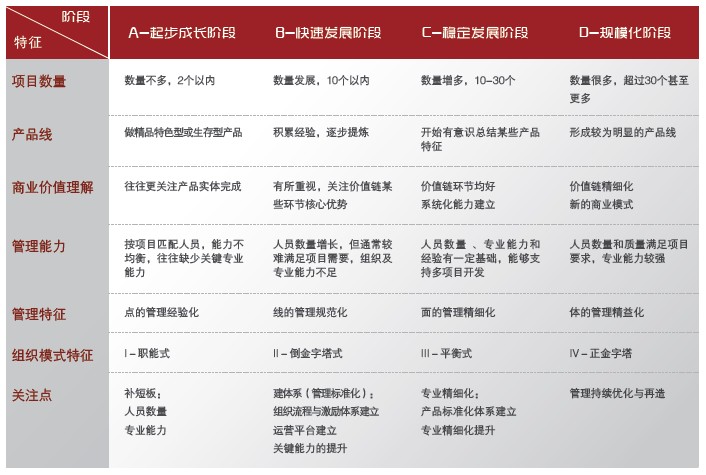 地产企业从创建到强大都会经历不同的发展周期:起步成长阶段、快速发展阶段、稳定发展阶段、规模化阶段,每个成长阶段都呈现不同的管理特征和组织模式特征,在全面预算、经营、计划运营、投资分析、设计、成本、采购、销售、人力资源等专业管理上也有不同的管控模式和深度。这决定了企业每个发展阶段都需要与之相适配的管理体系和管理信息系统,以支撑企业运作。