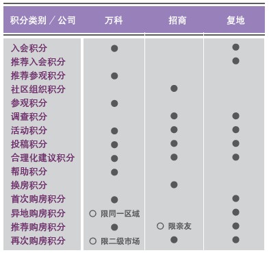 关于积分类别,万科分为2 大类10 小类,招商分为8 大类,复地会4 大类10 小类(表2)。万科比较有特点的是推荐参观积分和参观积分(推荐客户及本人参观楼盘可获积分);招商比较有特点的是社区组织积分(招商会旗下有5 个子品牌:招商会 ● 童子军、但昭义钢琴艺术中心、美伦葡萄酒俱乐部、青年动力营、老年大学,报名参加可获得积分)和换房积分(参与并完成招商地产旧房换新房计划可获得积分)。