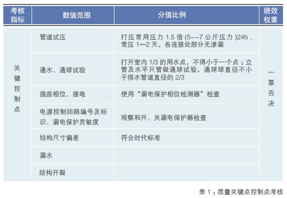实测实量:除协议书和专用条款另有约定外,各分项工程要求全部达到国家规定验收规范的合格标准,即按照现有国家规范达到分项工程主控项目100% 合格( 一般项目85% 合格的质量标准)。承包方应按分户对所有实测进行100% 实测实量并建立分户/ 分层实测档案; 监理公司对施工单位实测数据按不低于30% 的比例进行复测;发包方工程师对监理公司复测数据按不低于10% 的比例进行复测,如未能达到国家规范规定的合格标准,并在规定的整改期限内未能整改达标, 该部位的工程量将视为不合格工程。对实测实量的考核结果,采用相应的《质量考核奖惩机制》。质量关键控制点考核,如表1 所示: