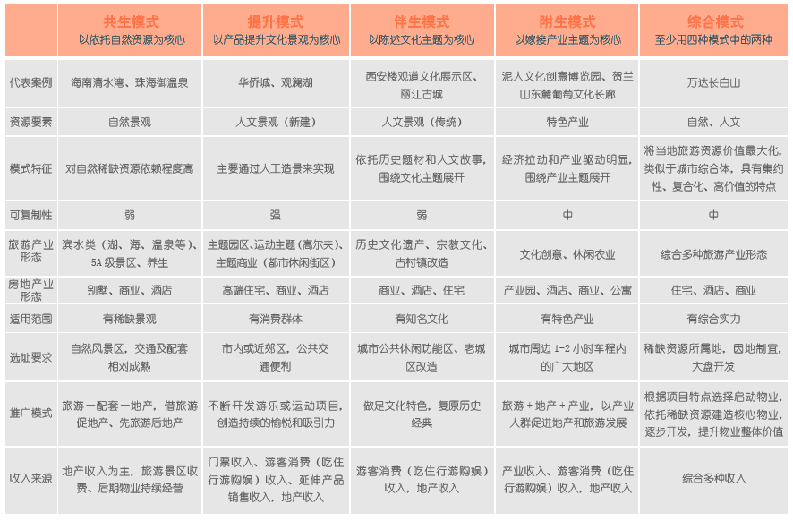 笔者认为,根据旅游资源和地产产品之间的关联程度分为共生模式、提升模式、伴生模式和附生模式,并在此基础上衍生出第五种模式综合开发。