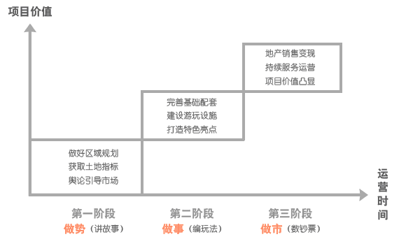 做事:在规划方案获得认可后,分块完成征地、拆迁、补偿及安置工作,进行大型旅游项目开发和游乐设施建设,营造具有影响力、冲击力的旅游景点,改善区域基础设施条件和环境质量,提升知名度,靠旅游业的关联带动作用引来人流、物流,将生地变成旅游熟地和旺地。通过基础设施建设和游乐设施建设拉动项目价值,科学设计游客的体验点和消费点,实现旅游资源的价值最大化。
