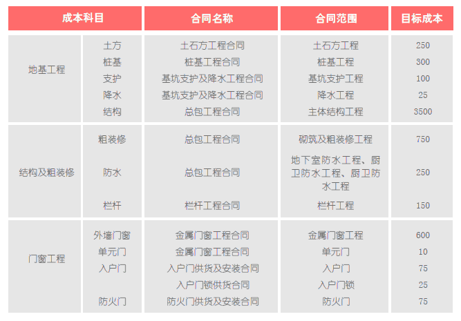 (4) 与成本科目对应并分解目标成本:将合同清单与成本科目对应,并将目标成本分解至各合同,形成各合同的成本控制目标。
