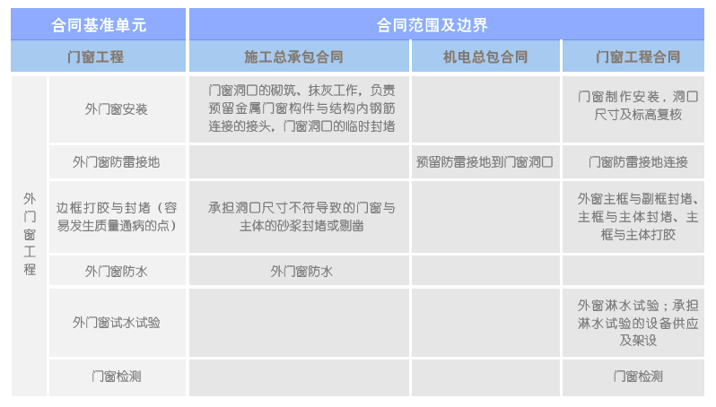 (1)合同界面: 合同界面(含实体界面、管理界面)的清晰划分有利于管理责任及质量责任的界定,同时减少工程变更、现场扯皮、质量通病的发生。企业应结合项目的实际情况在合同中明确相应的界面。合同界面示例: