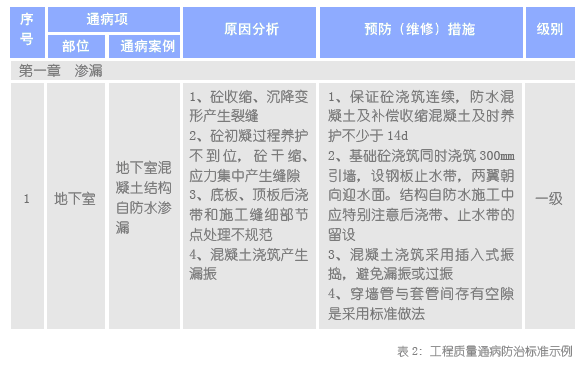 (2)工程质量通病防治标准: 针对公司已开项目出现的质量通病,如墙面开裂、地下室外墙外防水、钢筋混凝土现浇板裂缝造成渗水、卫生间防水渗漏等问题,建立公司层面的《工程质量通病防治标准》(设计技术措施和施工技术措施),其中设计基础措施主要预防含质量通病图集,示例如表2 :