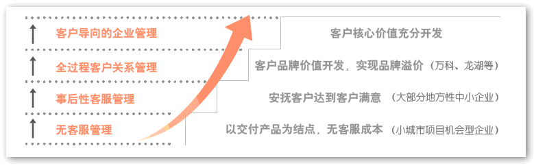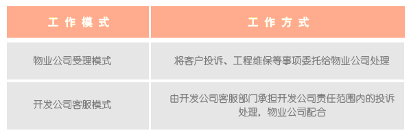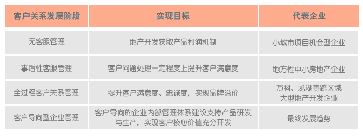 (2)适应企业。国内大部分地方性房企、甚至过百亿的大型地产企业都处于此种阶段。从纯粹的项目建设开发到与客户打交道,国内的地产企业也经历了学习香港、学习日本制造业的阶段,为了维护企业品牌形象、实现持续发展,开发公司也必须要面对业主的各项问题,并采取措施应对与安抚。
