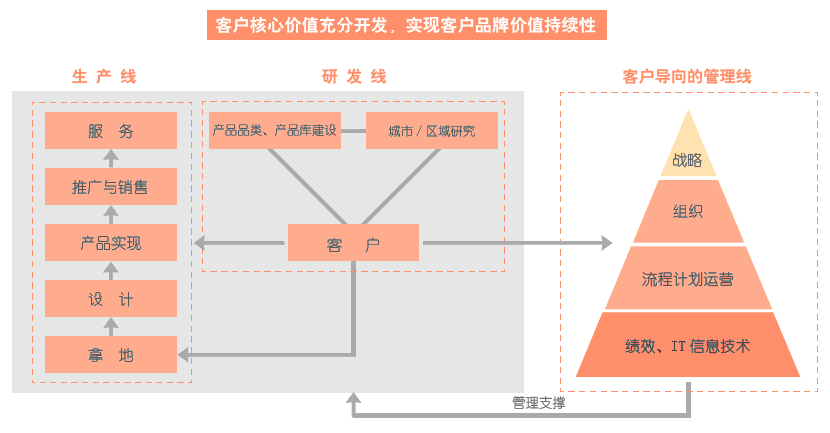 (1)客户导向型企业管理阶段特征。此阶段的管理模式以客户为中心,是对产品研发、项目开发、服务进行的系统性管理,并实现企业内部管理的提升,开发客户的核心价值,实现客户品牌溢价的持续性。这种客户导向的企业管理,不仅是针对客户关系管理,而是对地产企业内部管理的提升要求,其管理模式如图: