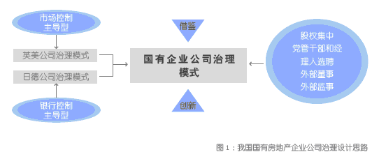 我国国有房地产企业的公司治理受政治制度、法律体系、经济基础和社会文化等方面的影响,与英美模式、德日模式存在较大差异。2007 年爆发的发端于美国的金融危机使发达国家的经济陷于持续低迷,公司治理也暴露出不少问题。公司治理的演变经验表明没有一种普遍适用的公司治理模式可以让我们复制。我国国有房地产企业公司治理的建设,要借鉴公司治理的他山之石,结合我国国有房地产企业股权集中、党管干部和经理人选聘、外部董事和外部监事委派等特点设计出可以攻玉的国有房地产企业的公司治理模式。图1 是我国国有房地产企业公司治理设计思路。