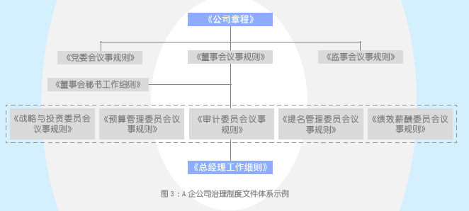 2、 编制A 企公司治理制度文件。在梳理明确国资委董事会经营班子三级两边界、外部董事在董事会中的比例过半、外部监事在监事会中的人数过半的基础上,编制形成了A 企的公司治理制度文件。通过文件明确董事会、监事会、党委会,董事会下设专业委员会和办公室;明确经营班子的权力、义务和职责,人员组成和任职条件,议事规则以及文件管理和决议事项的执行等。