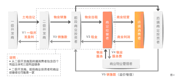 大型的商业项目,其利益链条中必须加入经营者(可能是投资者,也可能不是投资者),所涉及的利益链条明显增长为四层(即开发商销售给投资者,再由投资者出租给经营者,再由经营者从事商业经营活动,以便实现对终端消费者的服务——投资者以能否按预定的投资收益找到经营者来决定是否购买开发商的产品,而经营者以能否从终端消费者的商业经营收益中获利来决定是否承租投资者的商铺),如图2。
