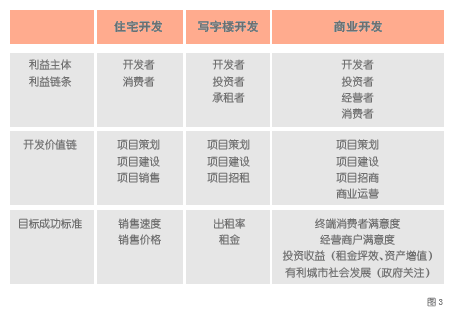 商业项目与住宅项目最核心的差异在于整个项目利益链条(利益主体及利益传递和实现的渠道)的不同,并由此导致开发价值链和项目成功判别标准出现了显著的差异。