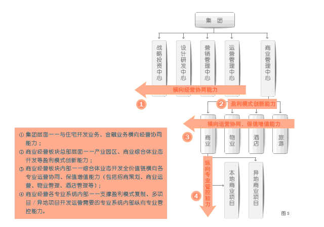 某深圳民营企业集团,经过近二十年的发展,集团旗下逐渐形成了房地产开发、商业经营、酒店管理、物业服务等专业公司。近年来,随着商业地产开发体量的增加和持有商业物业资产的增大,该集团原来独立分散、各自为战的商业管理模式存在以下主要问题:该集团通过在总部建立商业管理中心,充分整合商业管理资源,可以有效发挥四个方面的重要作用,如图5 :