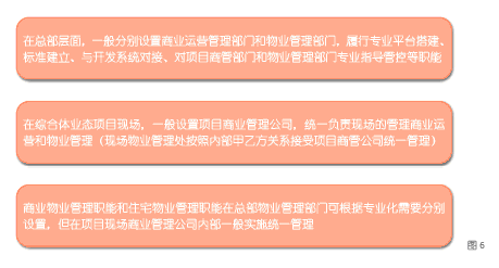 不论企业内部采用哪种架构, 对于大型商业综合体项目现场(如HOPSCA 类型的综合性商业广场) 来说,满足统一商业运营管理(含商业物业服务)的需要,提升对商业经营者和终端消费者服务的及时性、有效性,是企业必须首先去考虑的重要因素。