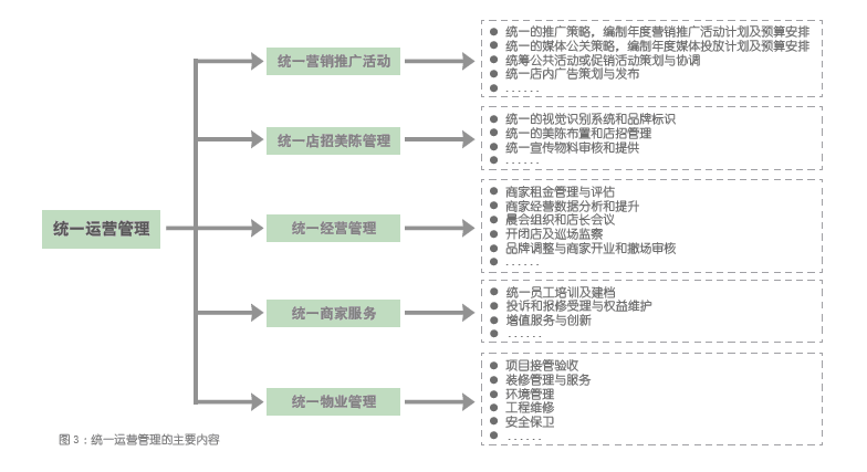 其实,统一店招和美陈、统一收银和经营分析、统一运营会议管理、联动商家推广活动安排、统一商家日常经营管理与检察均是保障运营品质的重要内容。