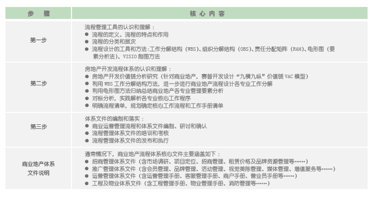 商业地产开发和运营管理流程设计之所以能够在企业中得到落实和追求,究其原因还在于它能够以正确的经营理念贯穿其中,以合适的流程保障运营管理的核心逻辑,以制度指引落实于工作细节,最终实现“科学管理”以及“专业深耕”。